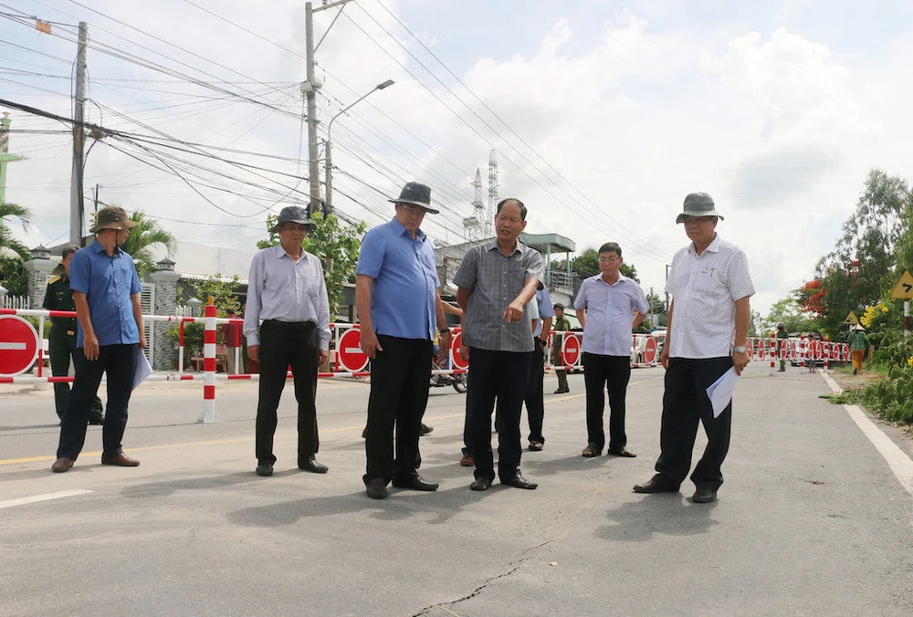 Chủ tịch UBND tỉnh An Giang cùng đoàn khảo sát vị trí xảy ra vết nứt. Ảnh: HD
