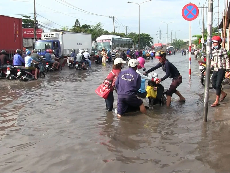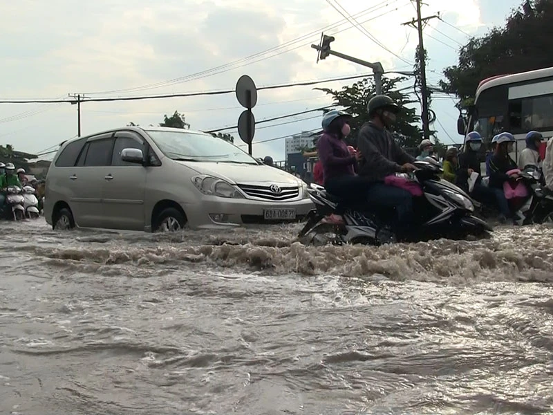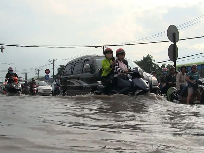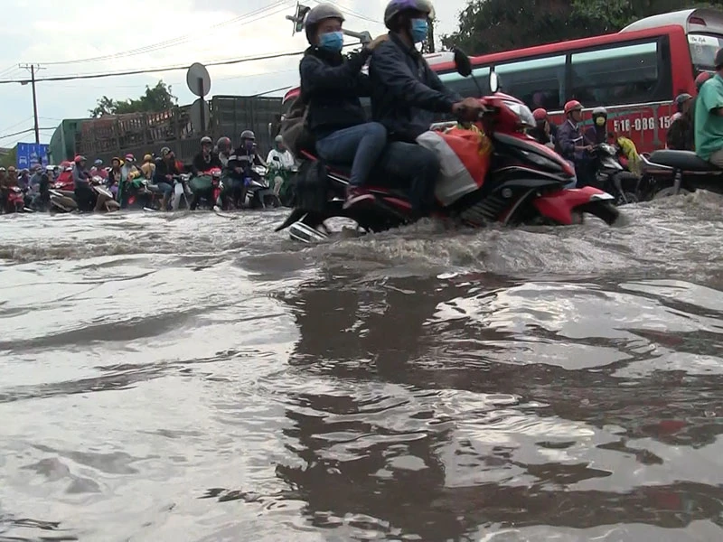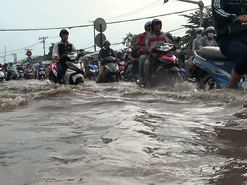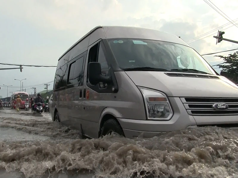 Cả hai chiều đường quốc lộ 1A đều bị kẹt xe nghiêm trọng. Nước dâng cao khiến các phương tiện di chuyển khó khăn.