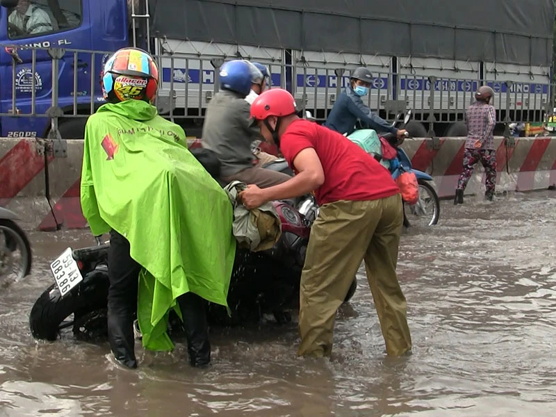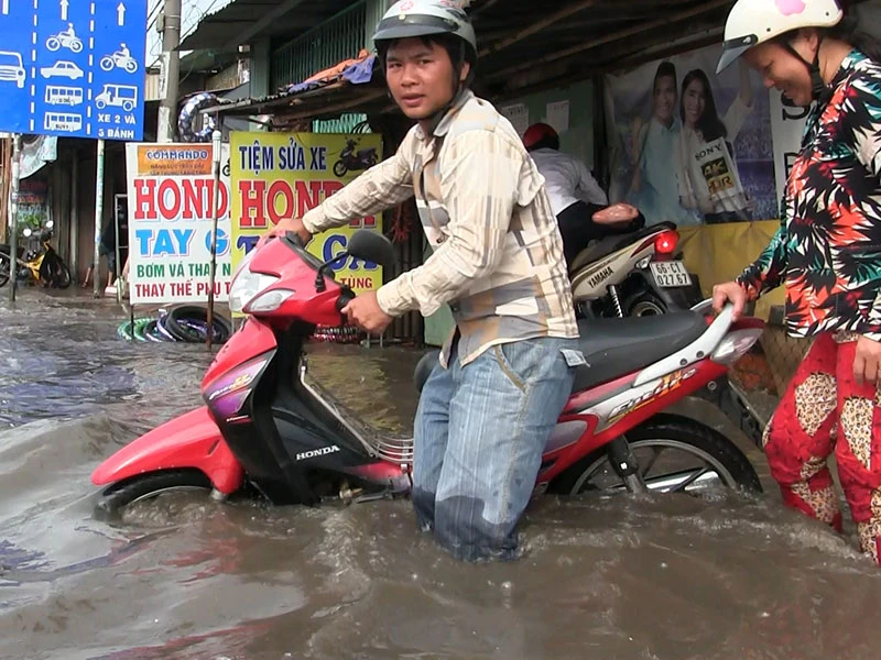 Hàng trăm phương tiện khó khăn di chuyển trong làn nước. Trong khi đó nhiều người bị hư hỏng xe phải dắt bộ.