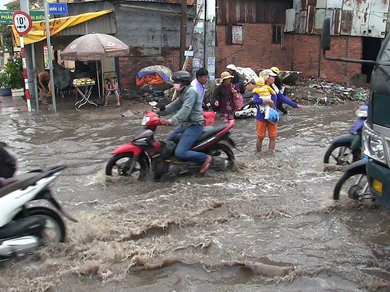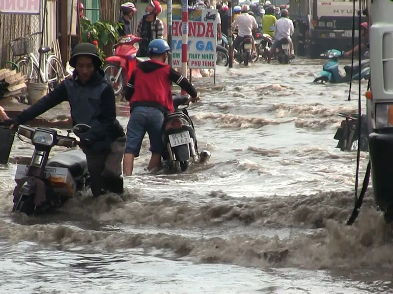 Do nước dâng cao, các phương tiện đi sát vào mé đường.