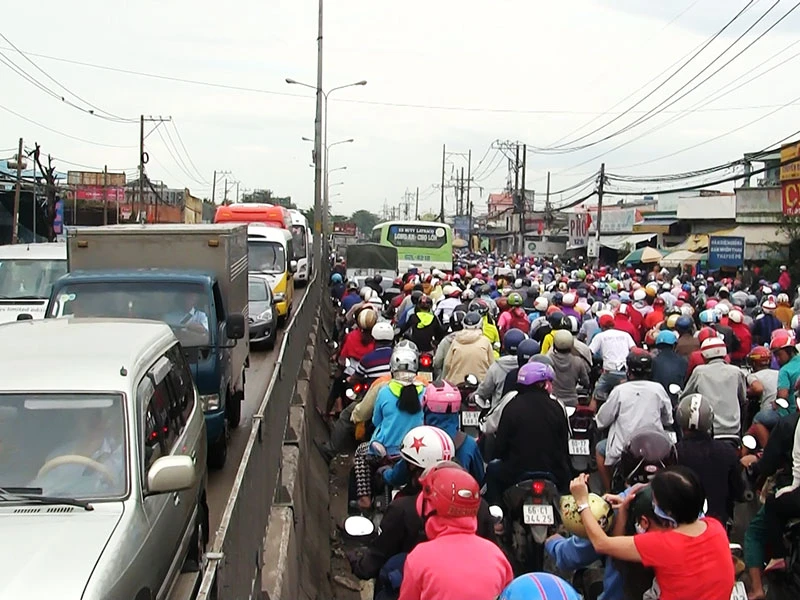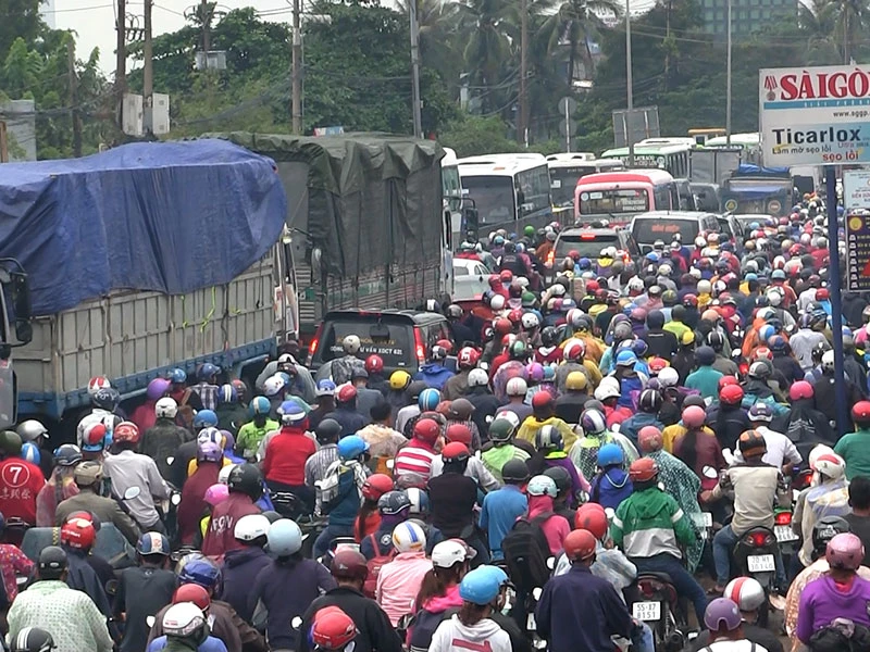 Nhiều người mang xách hành lý về quê nhưng ngao ngán với cảnh kẹt xe. "Tôi đi từ sáng sớm nhưng tình hình này thì tối mịt mới về tới nhà, đó là chưa nói đến xe hư" - anh Chiến, quê Vĩnh Long, nói.