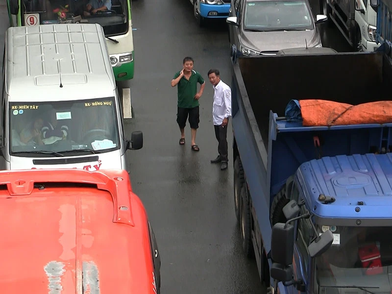 Trong khi đó, nhiều tài xế ô tô ra ngoài hút thuốc nói chuyện chờ hết kẹt xe.