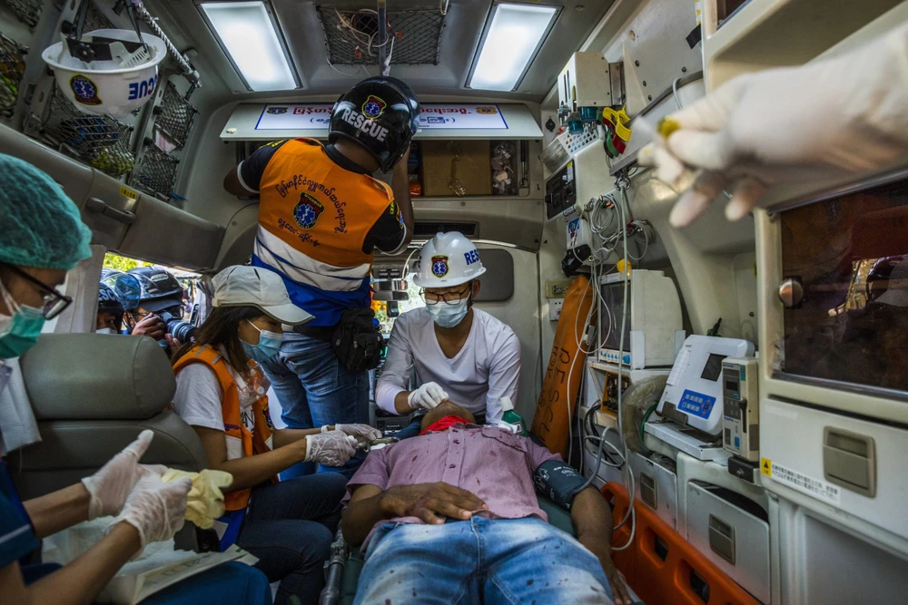 Nhân viên cứu hộ chăm sóc cho một người biểu tình bị thương do trúng đạn cảnh sát ở TP Mandalay ngày 28-2. Ảnh: REUTERS