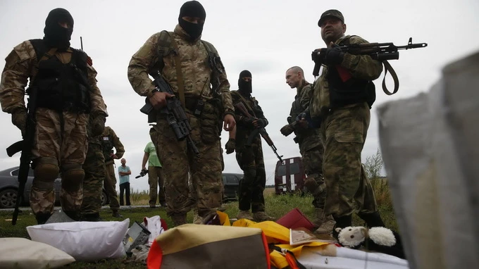 Các tay súng ly khai tại hiện trường vụ máy bay rơi. Ảnh: Reuters