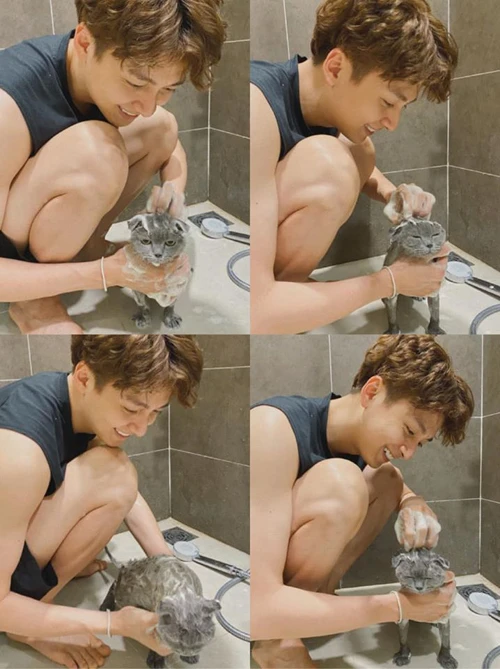 Ca sĩ Ngô Kiến Huy mỗi ngày tắm cho mèo cưng.