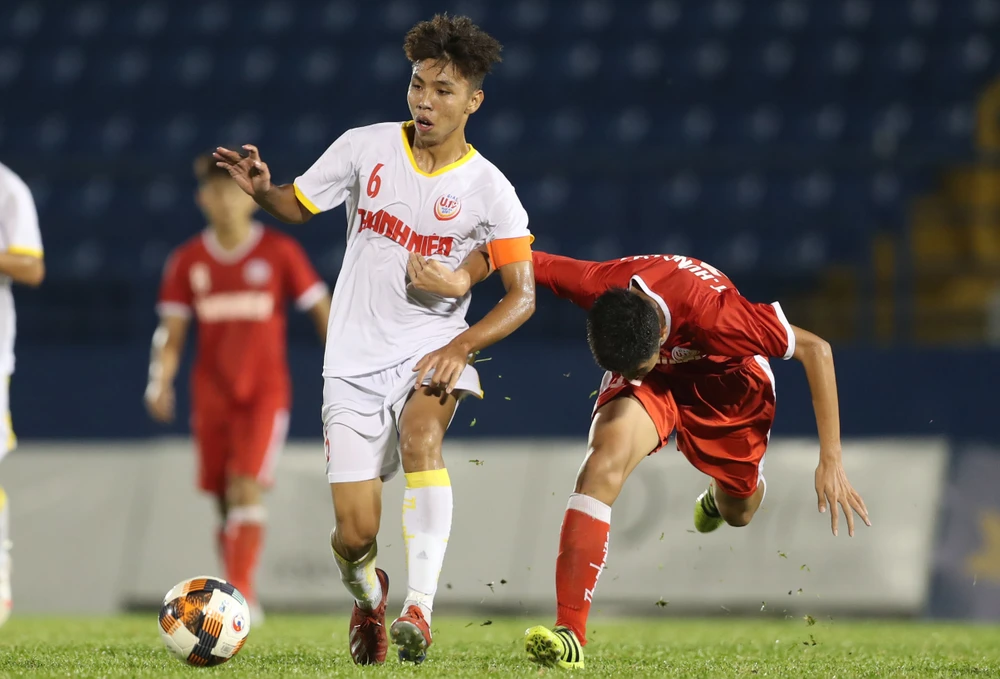 Cầu thủ Học viện NutiFood có lợi thế về hình thể và sức mạnh hơn những đồng nghiệp trẻ. Ảnh: ANH THÔNG.
