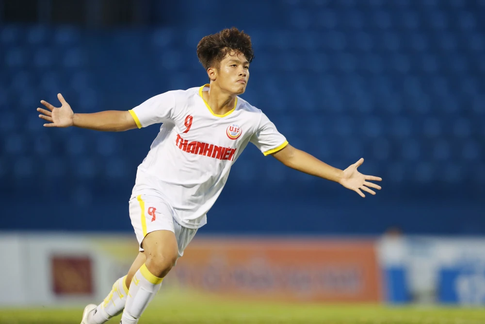 Quốc Việt ăn mừng bàn thắng sớm cho Học viện NutiFood JMG và sau hai trận, chân sút số 9 có đến bốn pha lập công ấn tượng. Ảnh: ANH THÔNG.