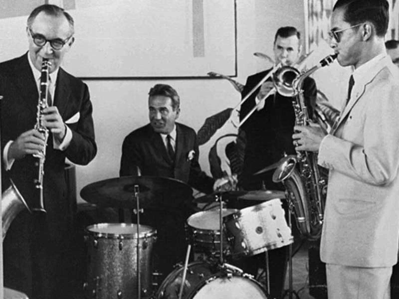 Quốc vương Thái Lan (phải) nổi tiếng là người đa tài, từng chơi saxophone với nhóm nhạc huyền thoại của Benny Goodman vào năm 1960. Ảnh: AP