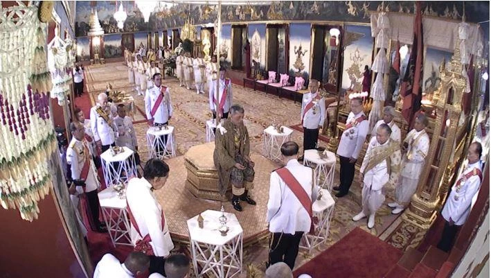 Ngay sau lễ quán đảnh, Quốc vương Maha Vajirusongkorn trong bộ áo choàng vàng đi đến ngai vàng Phatharabit, ngồi dưới chiếc lọng chín tầng của hoàng gia. Ngài được trao vương miện Chiến thắng nặng 7,3 kg, nhận biểu chương khắc tước hiệu chính thức, ấn tín.