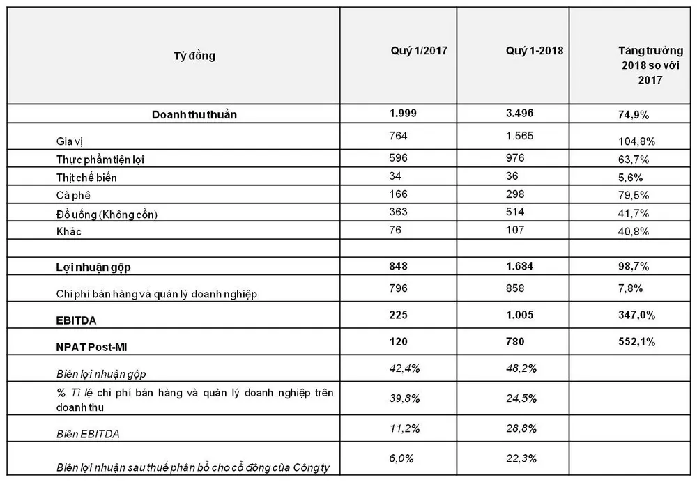 Cụ thể, Masan Consumer đạt lợi nhuận thuần phân bổ cho cổ đông của công ty là 780 tỉ đồng trong quý 1-2018. Trong đó, doanh thu thuần của MCH tăng trưởng 74,9% lên 3.496 tỉ đồng trong quý 1-2018 so với mức 1.999 tỉ đồng trong quý 1-2017. Mức tăng trưởng này đến từ phân khúc cao cấp và áp dụng các phát kiến cho các sản phẩm mới trong ngành hàng gia vị, thực phẩm tiện lợi, đồ uống và thịt chế biến.