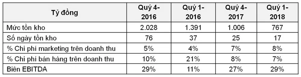 Hàng tồn kho được duy trì ở mức tối ưu là 2-3 tuần, bằng cuối năm 2017. Ngoài ra, MCH đã giảm bớt các chi phí khuyến mãi và đầu tư trọng tâm vào marketing để xây dựng các thương hiệu mạnh. Kết quả là EBITDA tăng 347,0% lên 1.005 tỉ đồng trong quý 1-2018 so với 225 tỉ đồng trong quý 1-2017. Bằng việc đầu tư trọng tâm vào marketing, MCH hiện trở thành một trong ba công ty quảng cáo lớn và hiệu quả nhất Việt Nam.