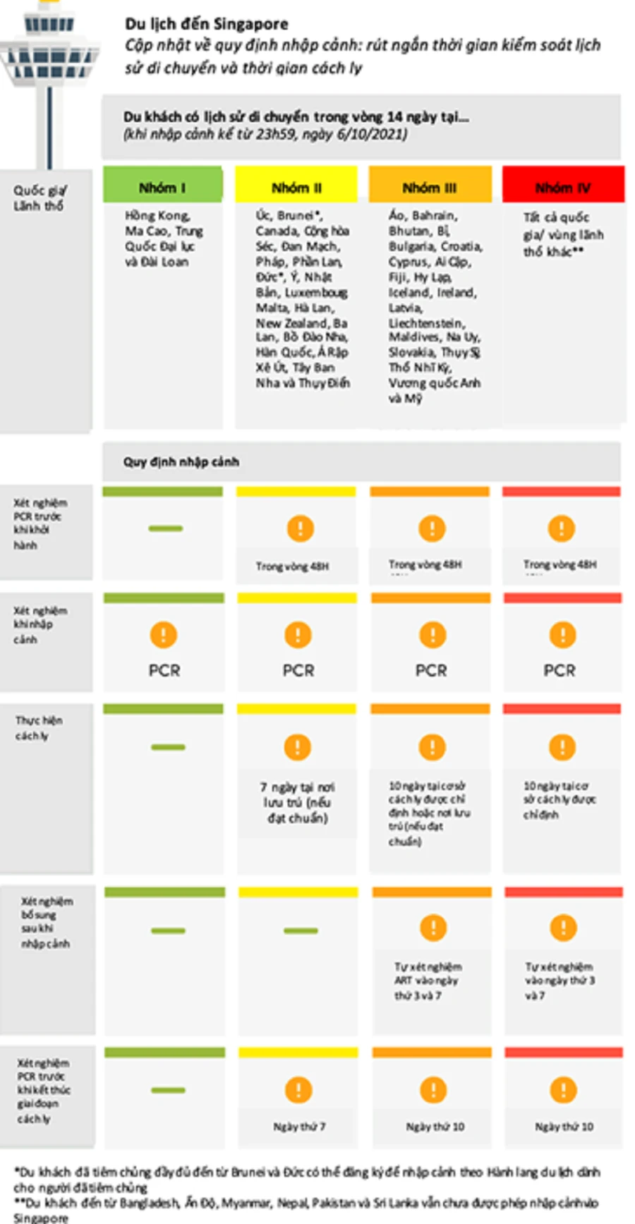 Tổng Cục Du lịch Singapore tại Việt Nam (STB) cho biết từ ngày 6-10, quy định về thời gian cách ly đối với du khách đến từ các quốc gia và vùng lãnh thổ thuộc Nhóm III và IV sẽ chính thức có hiệu lực.