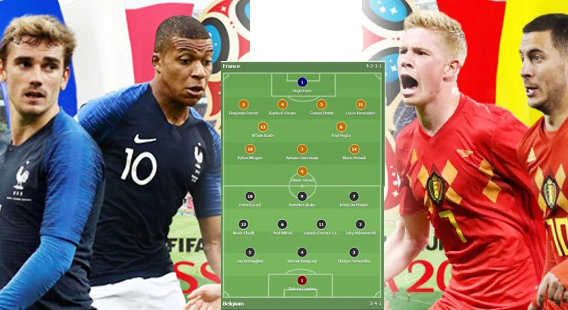 Pháp không có sự thay đổi so với đội hình đã thắng dễ Uruguay trong khi Bỉ có những xáo trộn do thiếu vị trí quan trọng ở hàng lang phải của Thomas Meunier. Vì thế HLV Martinez buộc phải có những xáo trộn nhằm gia cố cho hành lang này nghiêng nhiều về phương án an toàn hơn là gia tăng sức tấn công. Alderweireld Toby được trám vào để án ngữ nhằm hạn chế khả năng leo biên của cặp Matudi – Hernandez nhiều hơn.