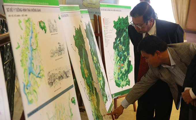 Các chuyên gia quy hoạch trong nước xem bản đồ quy hoạch Đà Lạt. Ảnh: Mai Vinh