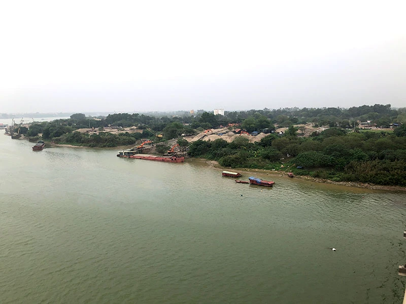 Nhiều đoạn ven sông Hồng trở thành bãi tập kết vật liệu xây dựng.