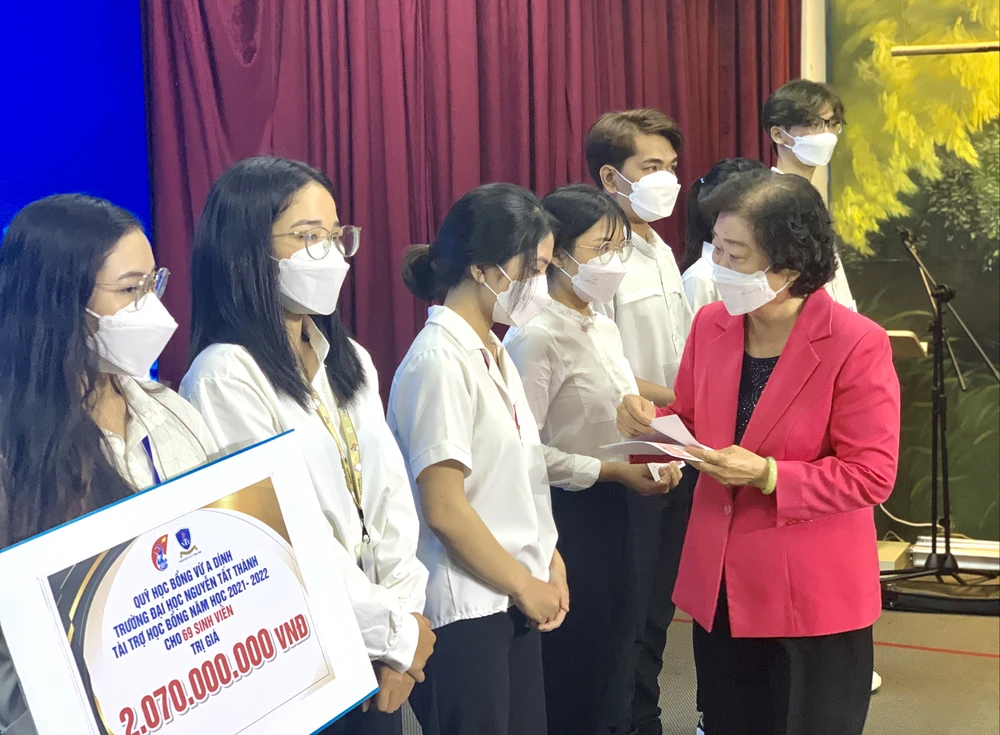 Bà Trương Mỹ Hoa, Chủ tịch Quỹ học bổng Vừ A Dính trao học bổng cho các em sinh viên. Ảnh: HL