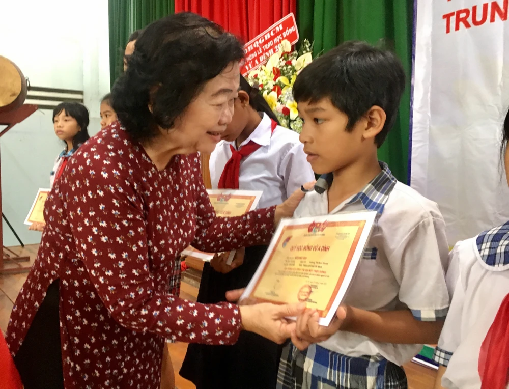 Bà Trương Mỹ Hoa trao học bổng cho các em học sinh. Ảnh: HL