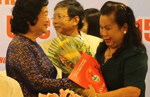 Bà Trương Mỹ Hoa tặng hoa cho nhà tài trợ Nguyễn Ngọc Thu, tổng giám đốc hệ thống nhà hàng làng nướng Nam Bộ. Ảnh: H.LAN