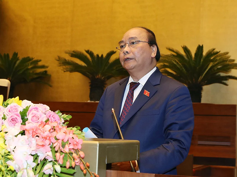 Thủ tướng Chính phủ Nguyễn Xuân Phúc trình bày Báo cáo về tình hình kinh tế-xã hội năm 2018 và kế hoạch phát triển kinh tế-xã hội năm 2019. Ảnh: TTXVN