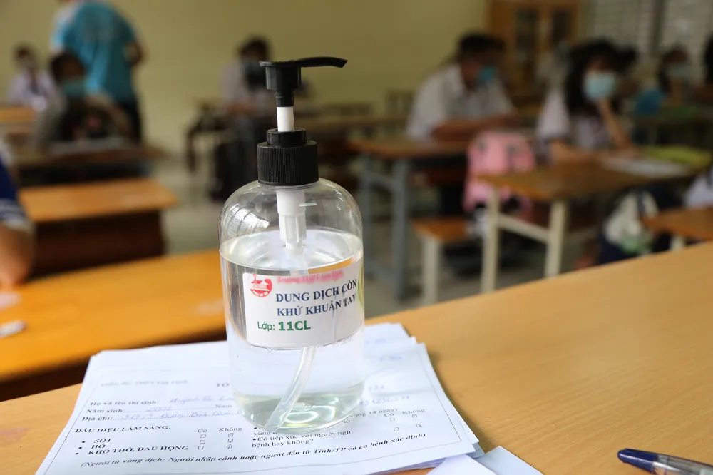 Trong phòng thi được trang bị dung dịch khử khuẩn tay dành cho thí sinh và giám thị.