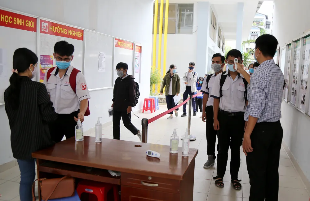 Sau khi đã rửa tay sát khuẩn trước khi vào cổng, các thí sinh tiếp tục được kiểm tra thân nhiệt và rửa tay sát khuẩn thêm lần nữa trước khi bước vào phòng thi.