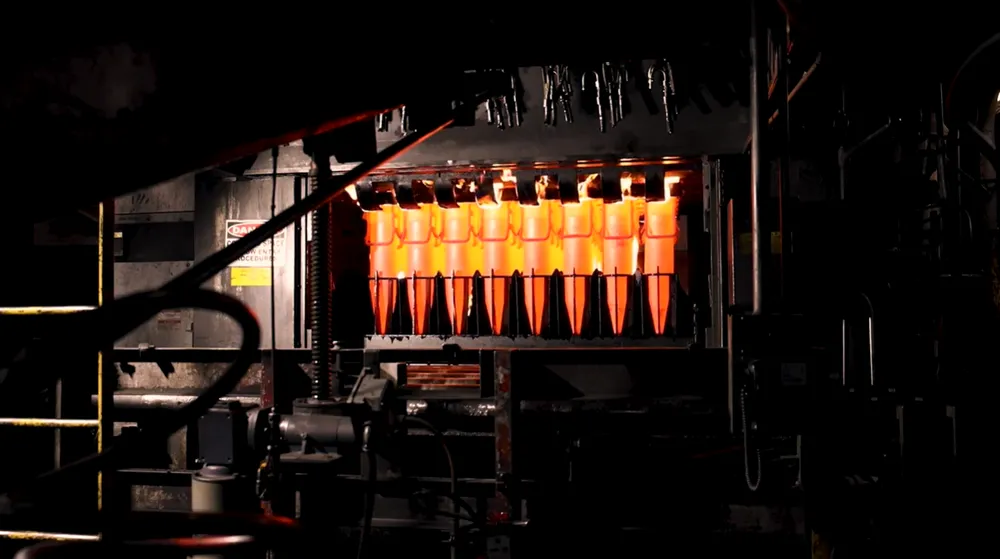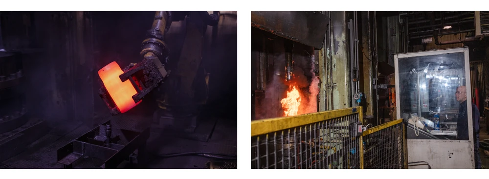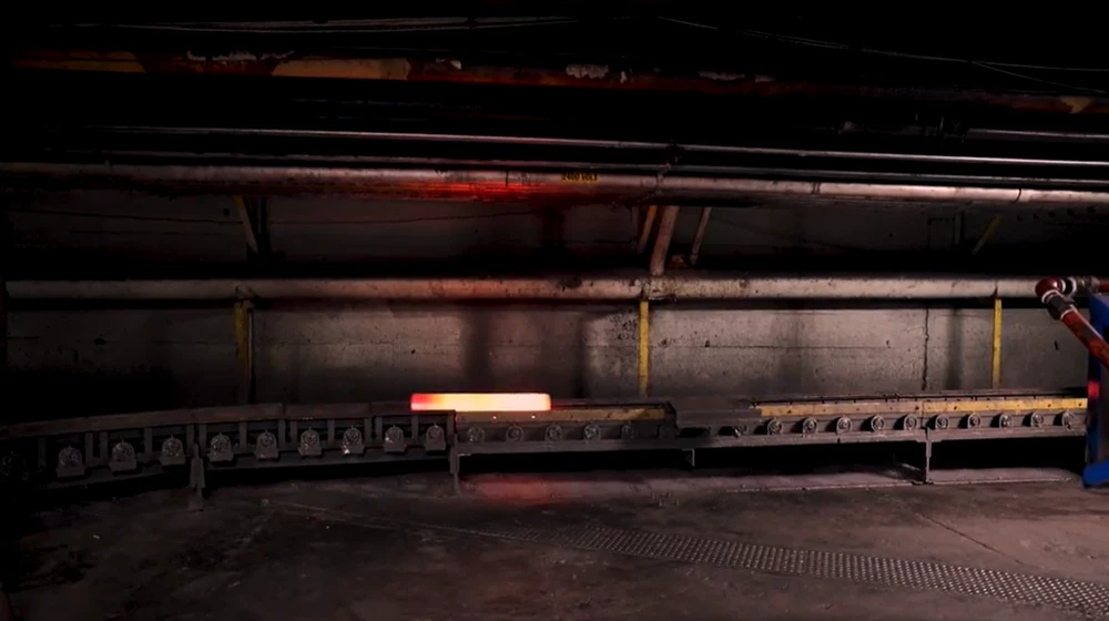 Một cánh tay rô bốt sẽ gắp các mảnh phôi thép này đưa vào các lò khí đốt tự nhiên nóng 2.000 độ trong khoảng 1 tiếng. Sau đó các phôi thép hình trụ nóng đỏ này sẽ được di chuyển trên băng chuyền để tới công đoạn tiếp theo.