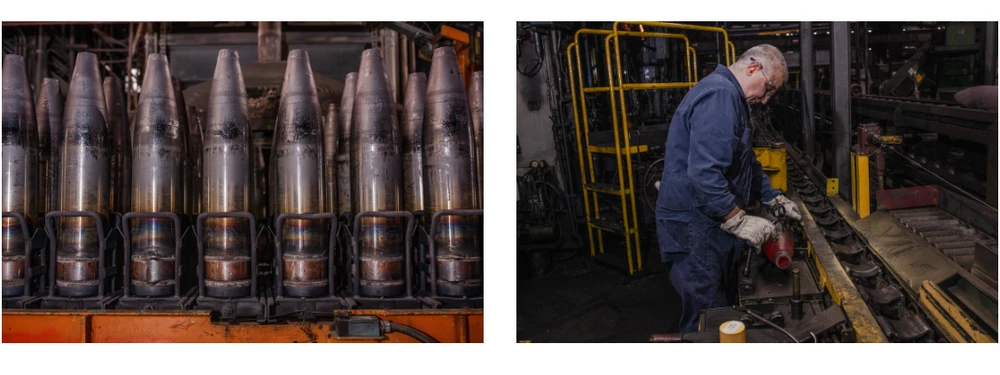 Các vỏ đạn thô được làm nhẵn và kim loại thừa được loại bỏ. Công nhân hàn các dải đồng xung quanh đáy của lớp vỏ đạn. Một chiếc máy khác nhanh chóng làm nóng và ép phần của vỏ thành một mũi đạn thuôn nhọn. Đến công đoạn này thì các phôi thép đã trông giống như vỏ đạn pháo, nhưng vẫn còn nhiều công đoạn nữa mới thành phẩm.