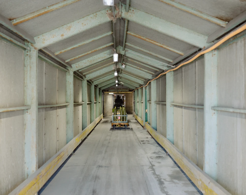 Sau khi được ngâm trong bồn nước ấm để hạ nhiệt, đạn được đưa qua một lối đi có mái che để đến phòng chụp X-quang.