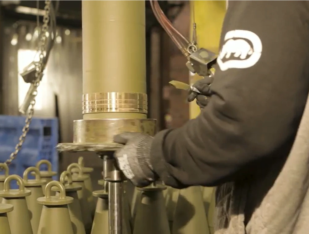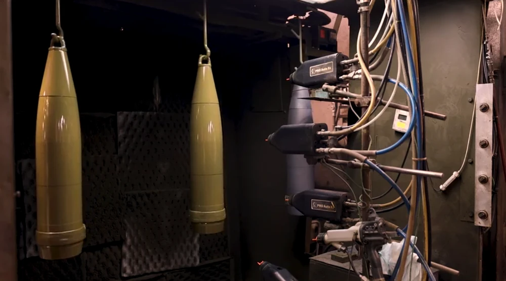 Các công nhân nâng các quả đạn pháo lên một giá đỡ và khắc các chữ cái IMX - Đạn dược không nhạy cảm (không dễ phát nổ khi bị tác động vô tình), lên vỏ.