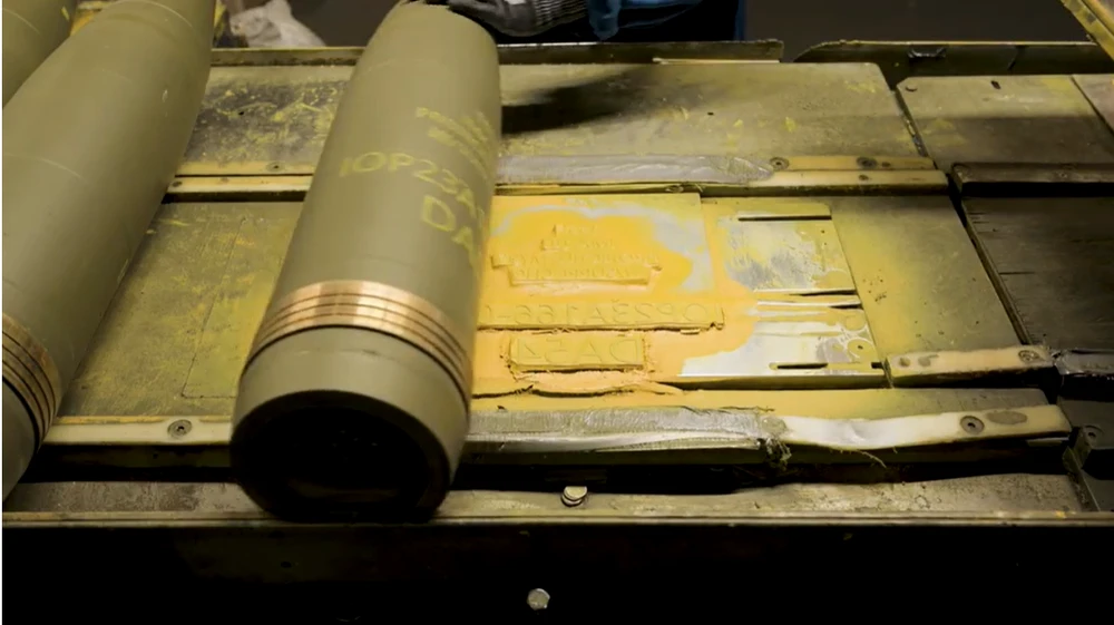 Những người khác tháo nắp vận chuyển ở trên mũi đạn ra, kiểm tra nhanh ở bên trong ruột đạn bằng đèn pin, sau đó chuyển các viên đạn xuống một đường băng tải và tia laser khắc số lô mới trên mũi đạn.