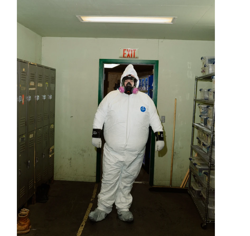 Lúc này, sẽ có công nhân đeo mặt nạ phòng độc và mặc đồ bảo hộ để làm việc trong tòa nhà ba tầng bên cạnh.