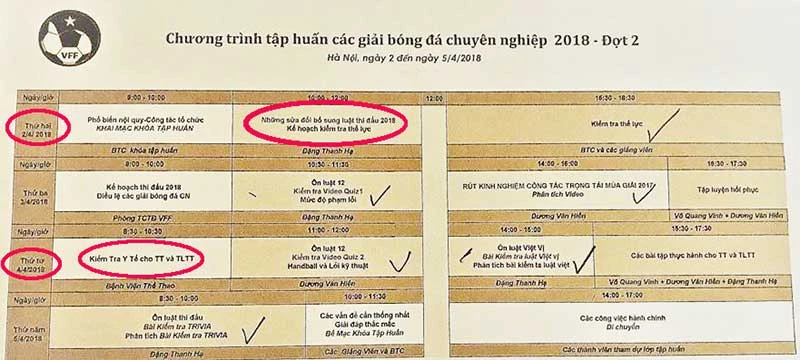 Và điều nhiều người trong giới chuyên môn thắc mắc là vì sao trong chương trình tập huấn trọng tài trước giải hạng Nhất năm nay lại đi theo quy trình ngược khác hẳn mọi đợt tập huấn trước và khác xa với đợt tập huấn cho giải chuyên nghiệp (xem bảng chương trình tập huấn của VFF kiểm tra thể lực ngày 2-4, kiểm tra y tế ngày 4-4 nhưng nhiều người thắc mắc là vì sao phần kiểm tra y tế vẫn chưa được thực hiện). Đó là bắt buộc các trọng tài kiểm tra thể lực trước vào ngày 2-4 rồi đến ngày 4-4 mới kiểm tra y tế. Nhìn vào đấy ai cũng thấy chương trình này hoàn toàn phản khoa học và tại sao chỉ có mỗi lần tập huấn này là đi trái quy trình?