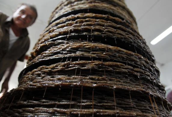 Sau khi xay, các ô liu được dàn đều trên đĩa nong, các lớp nong này được xếp chồng lên nhau.