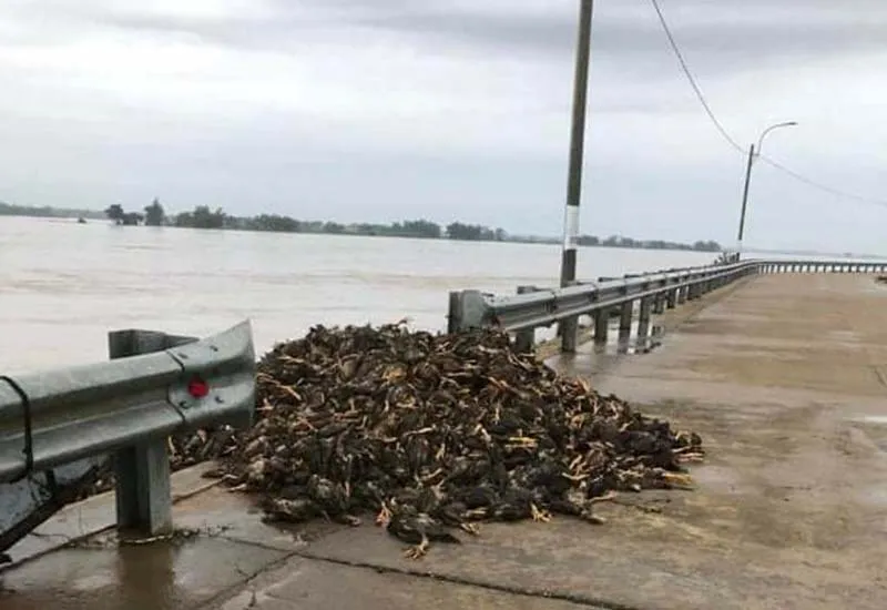 Lũ lên nhanh, không kịp di chuyển khiến gia cầm chết hàng loạt trên sông Ba. Ảnh: CTV