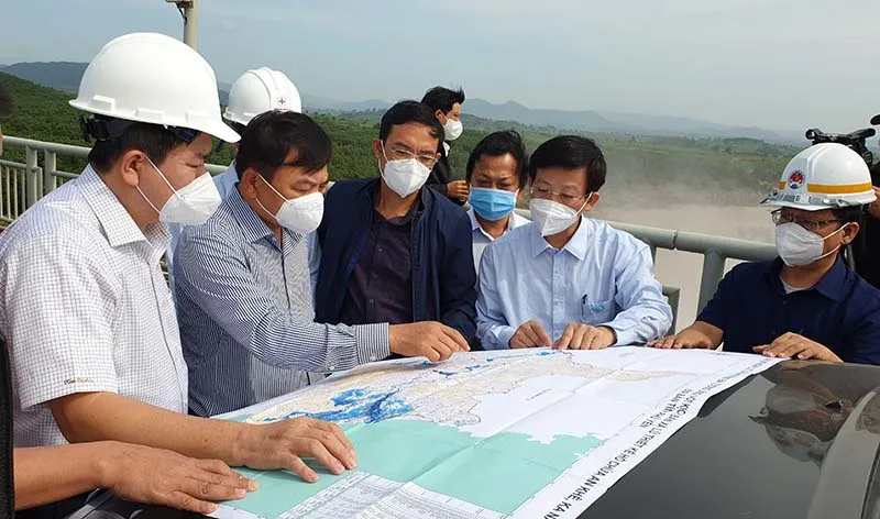 Thứ trưởng Nguyễn Hoàng Hiệp (thứ hai từ trái sang) trao đổi với ông Trần Hữu Thế, Chủ tịch UBND tỉnh Phú Yên (ngoài cùng bên trái) tại thủy điện Sông Ba Hạ. Ảnh: KHƯƠNG VY