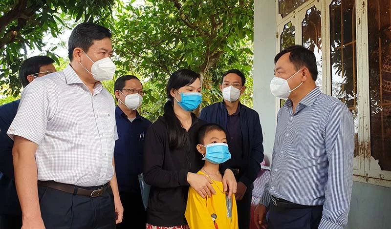 Thứ trưởng Nguyễn Hoàng Hiệp và Chủ tịch UBND tỉnh Phú Yên Trần Hữu Thế thăm hỏi, động viên gia đình bị thiệt hại do lũ. Ảnh: KHƯƠNG VY