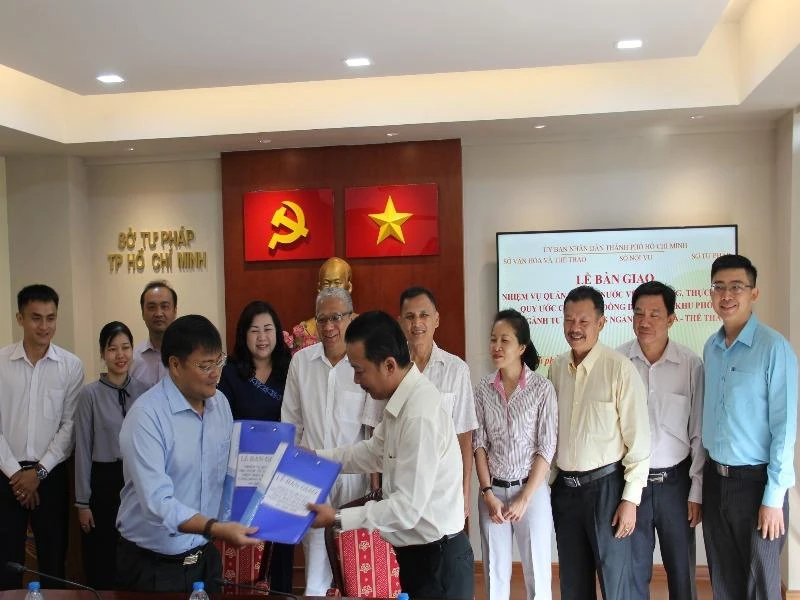 Ông Võ Trọng Nam (áo trắng), Phó Giám đốc Sở Văn hóa-Thể thao TP, nhận bàn giao từ ông Nguyễn Văn Vũ, Phó Giám đốc Sở Tư pháp TP.