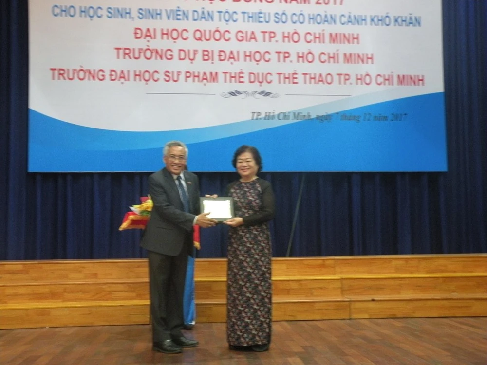 TS Lê Hữu Phước, Phó Hiệu trưởng Trường ĐH Khoa học Xã hội và Nhân văn TP.HCM, cho biết trong suốt 60 năm qua trường luôn nỗ lực vươn lên trong hoạt động dạy và học, luôn nhận được sự hỗ trợ giúp đỡ quý báu tận tình từ xã hội trong đó có Quỹ học bổng Vừ A Dính.