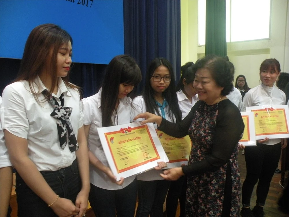 Bà Trương Mỹ Hoa, nguyên Phó Chủ tịch nước, trao tặng các suất học bổng cho các em HS-SV. Ảnh: NGUYỄN QUYÊN
