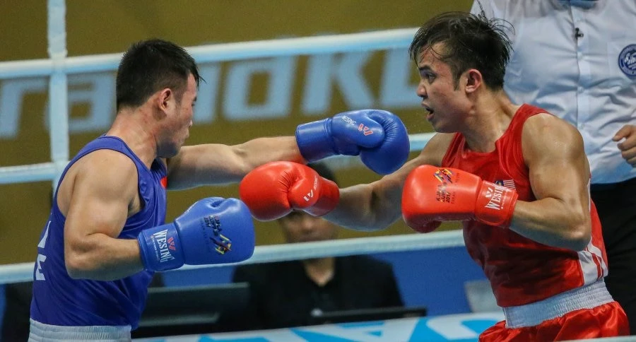 Võ sĩ Võ Văn Quế (găng xanh) gặp Adli Hafidz của Malaysia (81kg) tại SEA Games 29