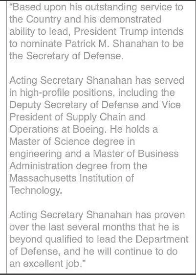 Theo Fox News, quyết định của tổng thống để ông Shanahan đảm nhiệm vị trí Bộ trưởng này là "dựa trên sự phục vụ xuất sắc đối với đất nước và khả năng lãnh đạo đã được minh chứng của ông", bà Sanders nói trên Twitter. "Quyền Bộ trưởng Shanahan trong vài tháng qua đã chứng tỏ ông có khả năng lãnh đạo Bộ Quốc phòng, và có thể tiếp tục đảm nhiệm vị trí này", tuyên bố nói.