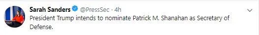 Trang Twitter của bà Sanders công bố ý định của Tổng thống Trump đề cử ông Shanahan.