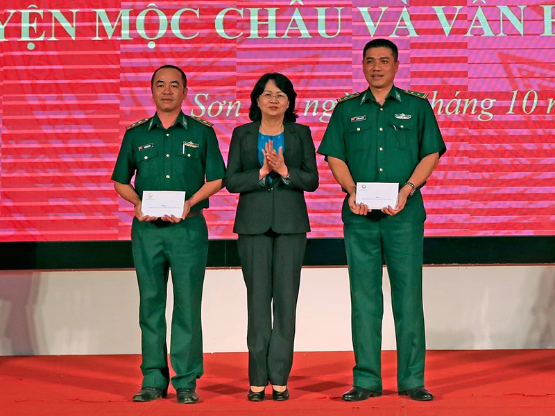 Quyền Chủ tịch nước Đặng Thị Ngọc Thịnh tặng quà cho hai đồn biên phòng Lóng Sập và Tân Xuân (Sơn La). Ảnh: TTXVN