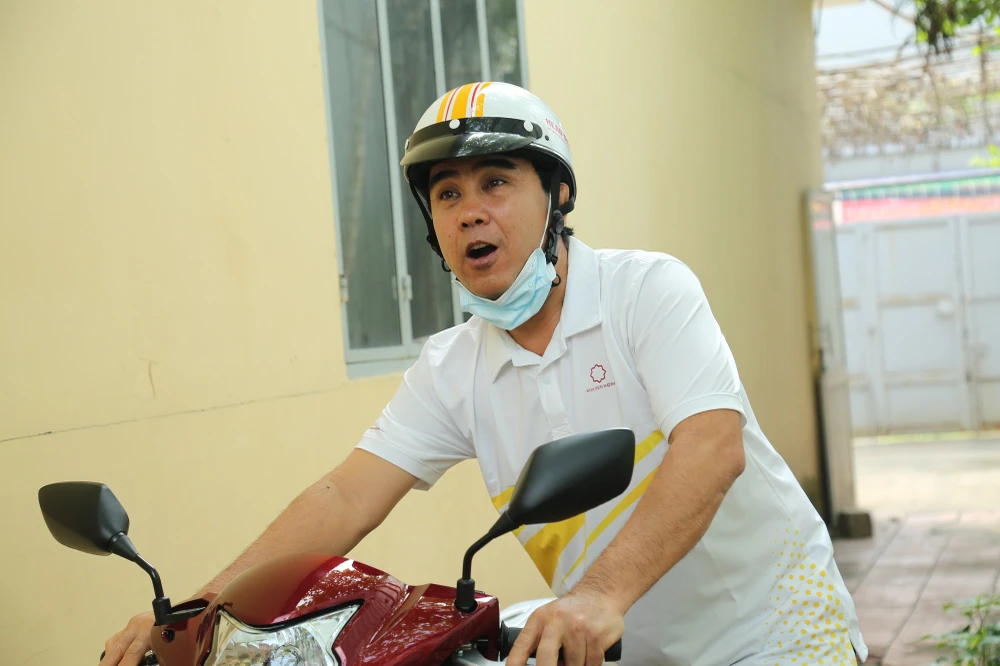 MC Quyền Linh trực tiếp mang một chiếc xe máy tới tặng cho nữ hộ sinh Vũ Thị Chinh. Ảnh: BEE