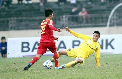 Cú vào bóng của Quế Ngọc Hải khiến Anh Khoa phải đi nạng.