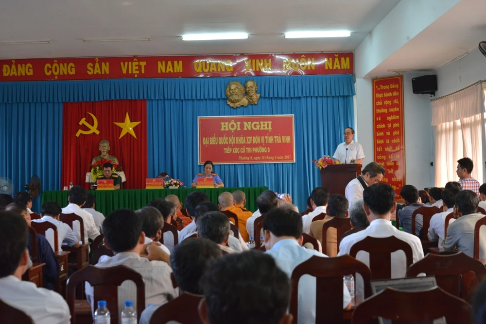 Tiếp tục chương trình tiếp xúc cử tri tại Trà Vinh, chiều 12-5, Đoàn ĐBQH đơn vị tỉnh Trà Vinh trong đó có ông Nguyễn Thiện Nhân, Bí thư Thành ủy TP.HCM, đã có buổi tiếp xúc cử tri phường 9, TP Trà Vinh.