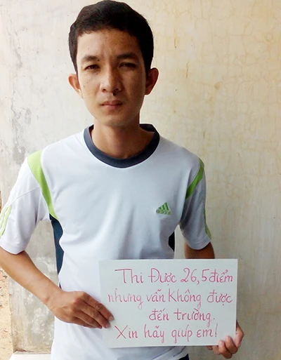 Khoảng 9 giờ ngày 31-8, tại khu vực cạnh chợ Mũi Né (TP Phan Thiết, Bình Thuận), nhiều người đi đường và du khách khá bất ngờ khi thấy một thanh niên ôm trước ngực tấm bảng với nội dung “Thi được 26,5 điểm nhưng vẫn không được đến trường. Xin hãy giúp em!”.