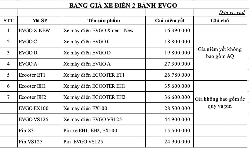 Các mẫu xe còn lại gồm Xe VS125 có thiết kế cá tính, khả năng vận hành mạnh mẽ với quãng đường di chuyển lên đến trên 150 km/lần sạc. Và EVGO A được thiết kế thời thượng, mang phong cách Ý với 2 phiên bản: Sử dụng ắc quy Chì-axit 12V20Ah với quãng đường đi được là 70km/lần sạc điện; Sử dụng Pin Lithium 60V40AH cho quãng đường đi được lên tới 110 km/lần sạc điện.