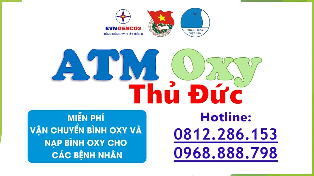 | Thông tin: Chương trình ATM Oxy Thủ Đức, Hotline: 0812286153 – 0968888789, https://www.facebook.com/ATMoxyThuDuc Khi có nhu cầu cung cấp, đổi bình oxy, người dân, bệnh nhân có thể liên hệ đường dây nóng của Thành đoàn Thành phố Thủ Đức - 0812.286.153 và số 0968.888.798 của Đoàn Khối cơ sở Bộ Công Thương tại TP.HCM. Đoàn Thanh niên Tổng Công ty Phát điện 3 cũng tạo kênh Zalo, Facebook “ATM Oxy Thủ Đức” để tiếp nhận thông tin, nhu cầu oxy từ người dân trên địa bàn. |