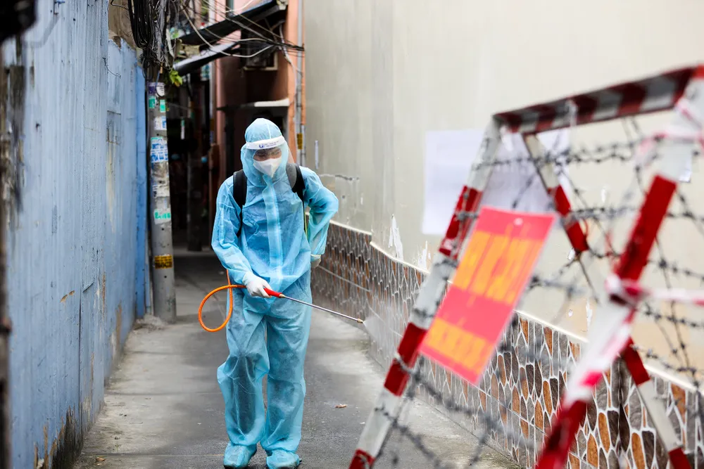 Đội phun khử khuẩn có mặt tại một con hẻm phong tỏa trên đường Phạm Thế Hiển, quận 8, TP.HCM.